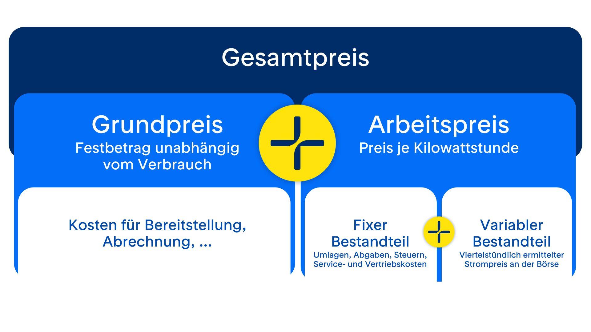 Der Strompreis besteht aus einem verbrauchsunabhängigen Grundpreis und einem verbrauchsabhängigen Arbeitspreis. In den Arbeitspreis fließen zum einen als feste Preisbestandteile Umlagen, Abgaben, Steuern, Netznutzungsentgelte sowie die Service- und Vertriebskosten ein. Hinzu kommen als variabler Preisbestandteil die Strombeschaffungskosten. Dieser Bestandteil ist an die Entwicklung der Strombörse gekoppelt und ändert sich viertelstündlich.